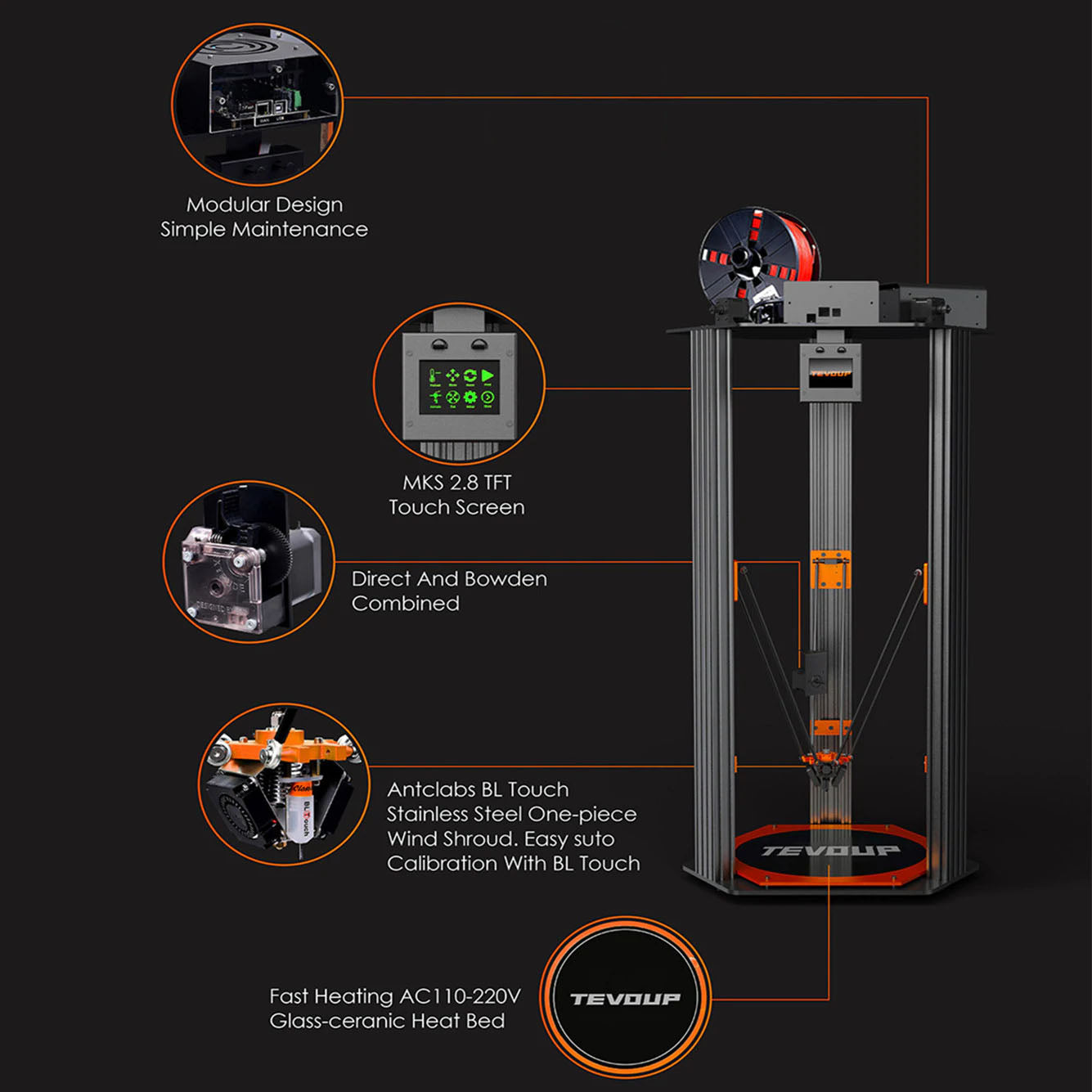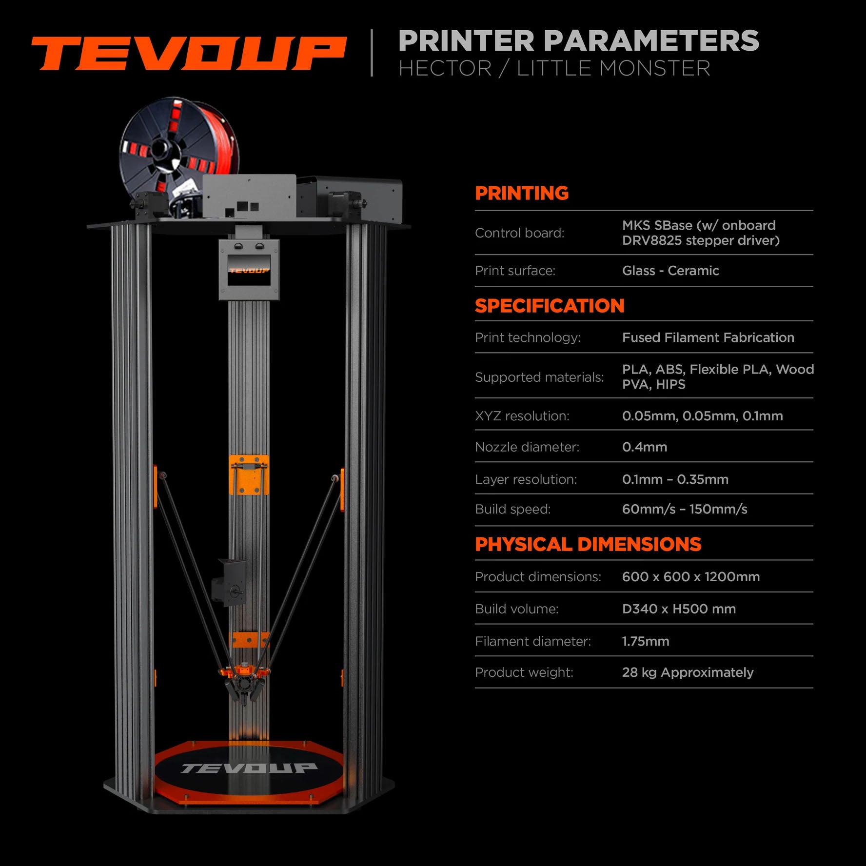 - Delta 3D printer: As with most delta 3D printers, the moving components of the Tevo Little Monster are very lightweight. That makes the hotend easier to travel, resulting in faster printing speed (up to 300 mm/s with greater accuracy). Also, Delta 3D printers are great when it comes to building higher objects.