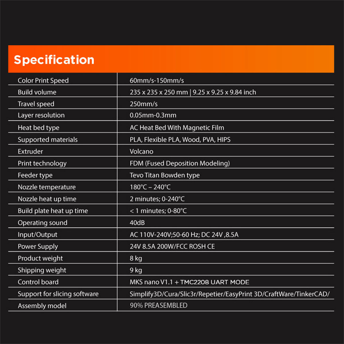 TEVOUP TARANTULA PRO 3D PRINTER FDM(235X235X250MM)
